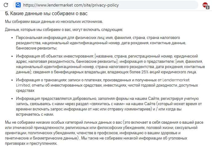 В соответствии с Политикой конфиденциальности инвестиционной компании LenderMarket Com, опубликованной на ее официальном сайте, количество персональных данных участников этой кредитной программы достаточно обширно: кроме паспортных данных собираются различные сведения о финансовой деятельности, включая банковские реквизиты клиентов.