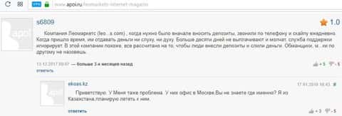 Несколько клиентов форекс-кухни Лео Маркетс высказались по поводу работы с данным брокером. И вот один человек пишет, что конторщики очень были настырными и внимательными перед тем как он вкладывал деньги. Когда финансы дошли до карманов аферистов, все резко перевернулось и они перестали звонить, а просто молча аналитики зашли на счет клиента и слили все под ноль. А вот другого клиента настолько все достало, что ему даже не лень ехать искать мошенников конторы LeoMarkets из Казахстана в Москву. Интересно чем закончилась эта история, ведь контора давно уже исчезла из виду.