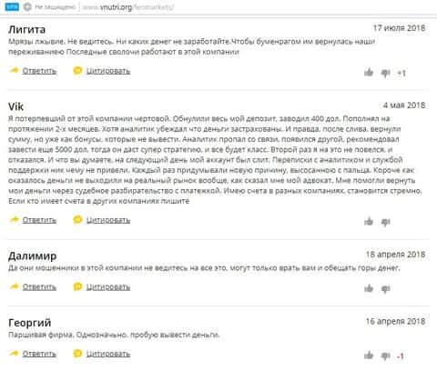Согласно отзывам, которые написали кинутые клиенты брокером Лео Маркетс, это компания довольно жуткая забегаловка. Одного клиента они обворовали на 270 долларов США, а потом когда он решил проверить отзывы и сообщил им о негативных отзывах в интернете, они ответили, что это все конкуренты завидуют и пишут гадости, но как оказалось потом это была чистая правда.Теперь они просят отправить еще денег вместе с копией паспорта и фотки банковской карты. Обычно мошенники делают это в своих корыстных целях, чтобы собрать базу клиентов и перепродать другим жуликам, которые могут оформить на них кредиты. Хорошо, что человек вовремя стал искать информацию об этом лохотроне, иначе попался бы еще в одну ловушку. И еще много описаний историй, которые идентичны по своему результату - почерк одного и того же преступника всегда можно заметить.