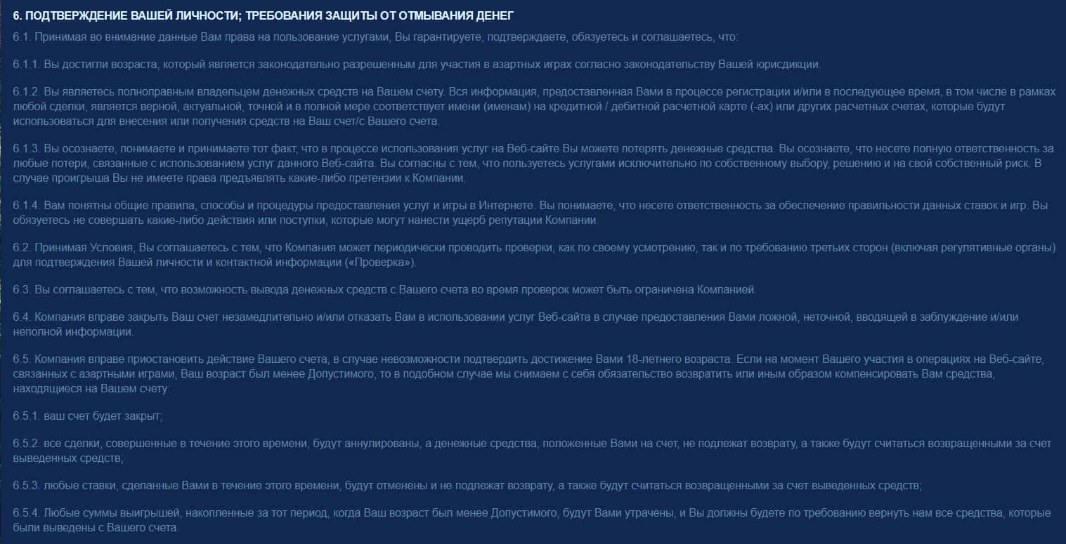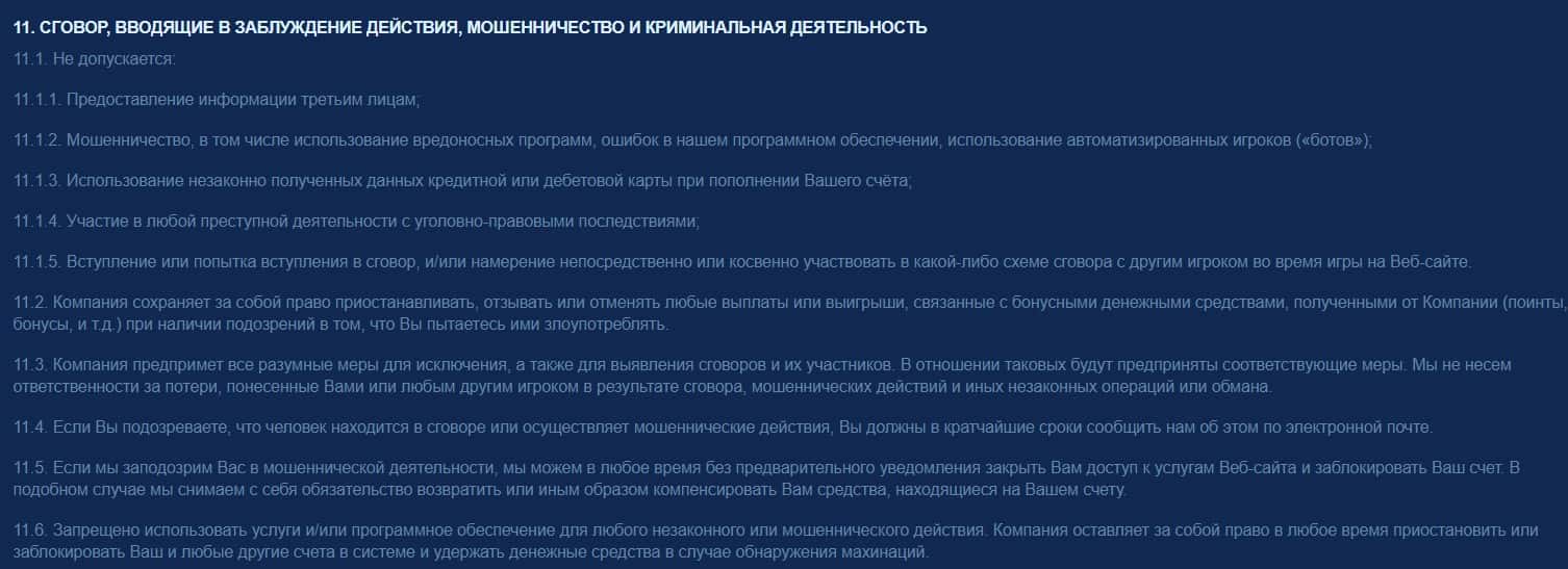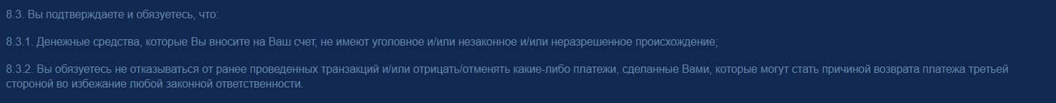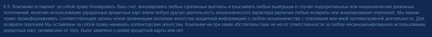 Согласно пункта 8.9, компания имеет право забирать средства, имеющиеся на счету клиента, если заподозрит его в совершении мошеннических действий.