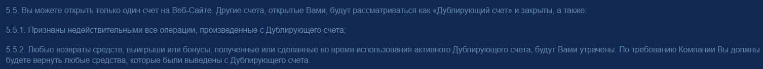 Пункт 5.5 клиентского соглашения Лев Казино уведомляет игрока, открывшего два или более аккаунтов, что он будет заблокирован, а все его средства удержаны в пользу компании.
