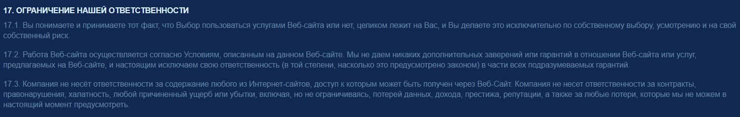 Прочитав раздел 17 договора Лев Казино, пользователь узнает, что контора снимает с себя ответственность за любые потери и убытки клиента на своем сайте.