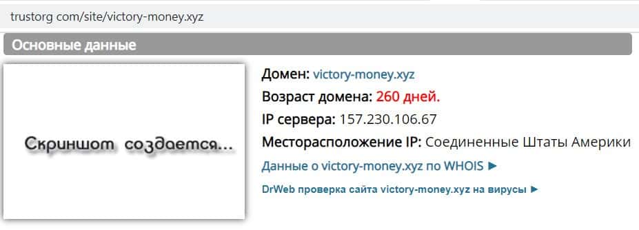 Возраст доменного имени victory-money xyz составляет 260 дней. Контора работает небольшое количество времени, поэтому о доверии к ней не может быть и речи.