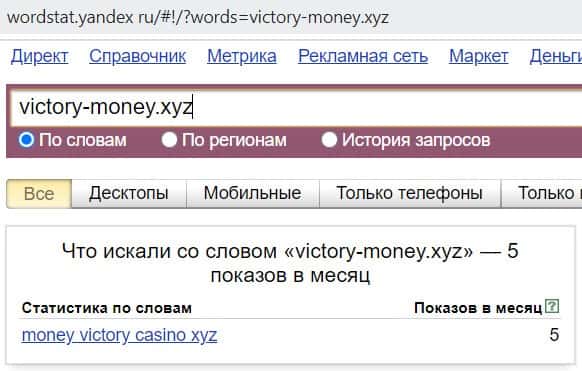 В поисковой системе Яндекс сайт он-лайн казино "victory-money.xyz", вбитый в строку с точкой, пользователи искали 5 раз.