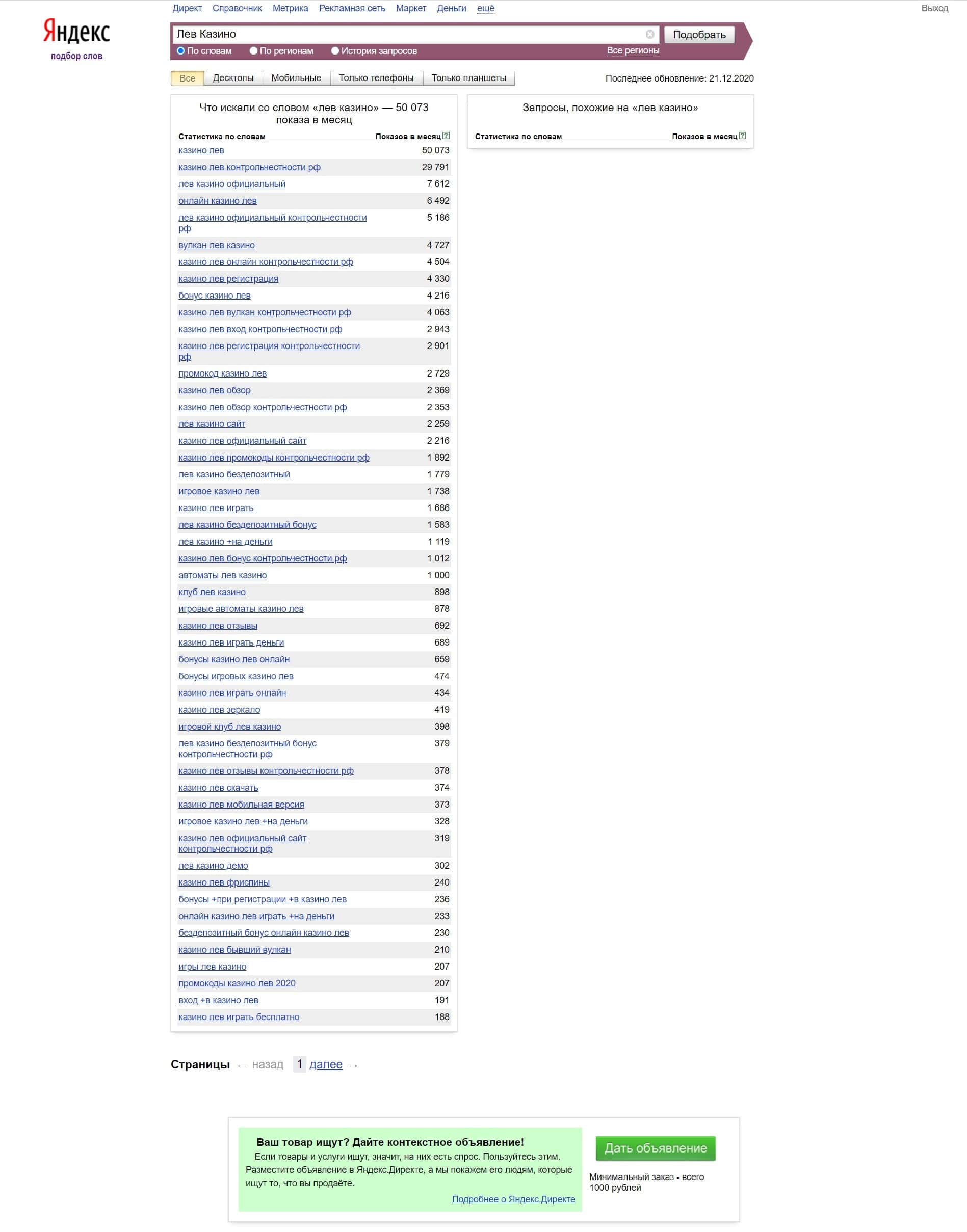 Посмотрим, сколько раз люди искали название бренда "Лев Казино" на русском языке с пробелом: результат - 50073 показа.