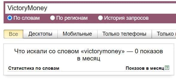 Название мошеннической конторы "VictoryMoney", написанное на английском языке, пользователи не искали в системе Яндекс, результат - 0 показов.