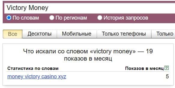 То же название "Victory Money", но написанное с пробелом, пользователи пытались найти в системе Яндекс с таким результатом: 19 показов.