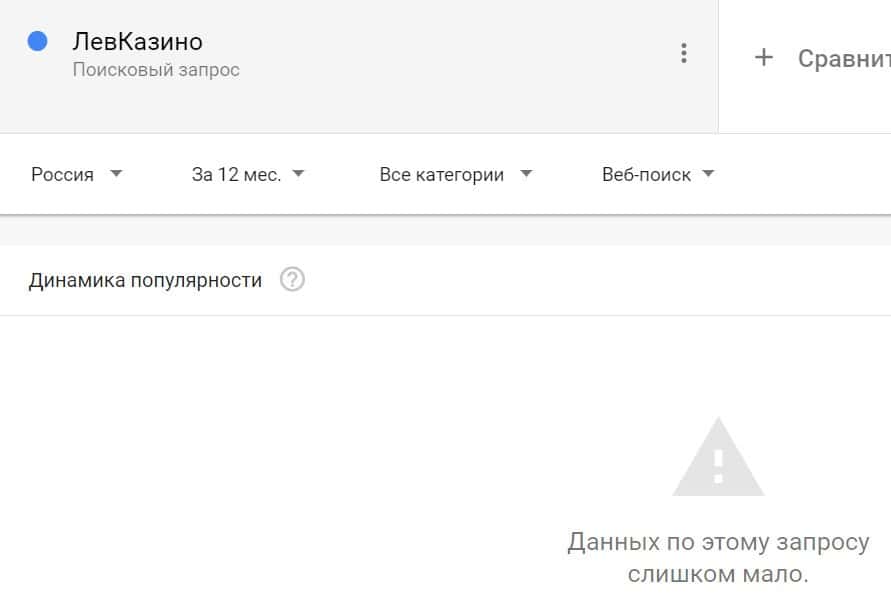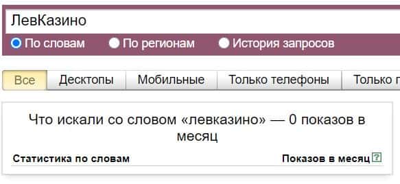 Название бренда на русском языке без пробела "ЛевКазино", пользователи пытались найти в системе Яндекс 0 раз за месяц.
