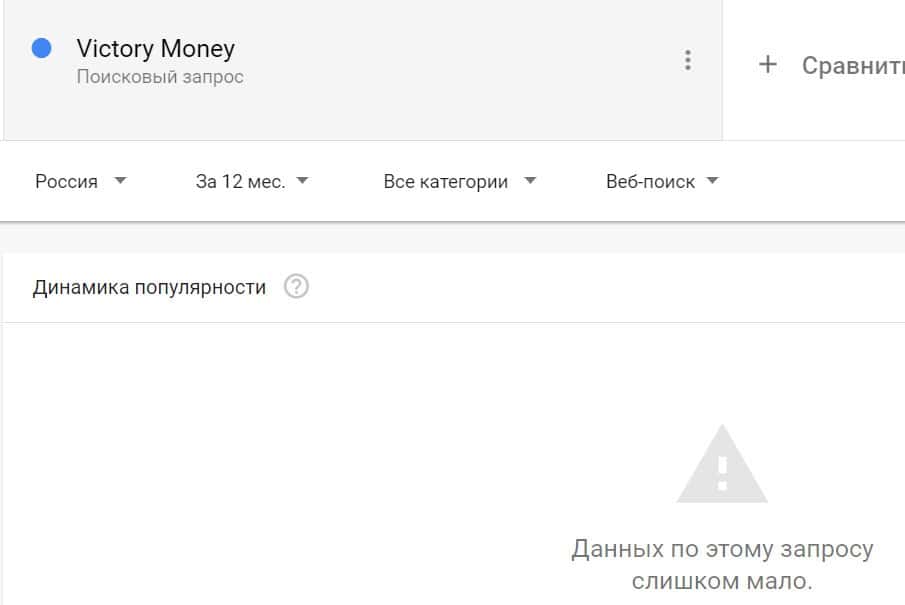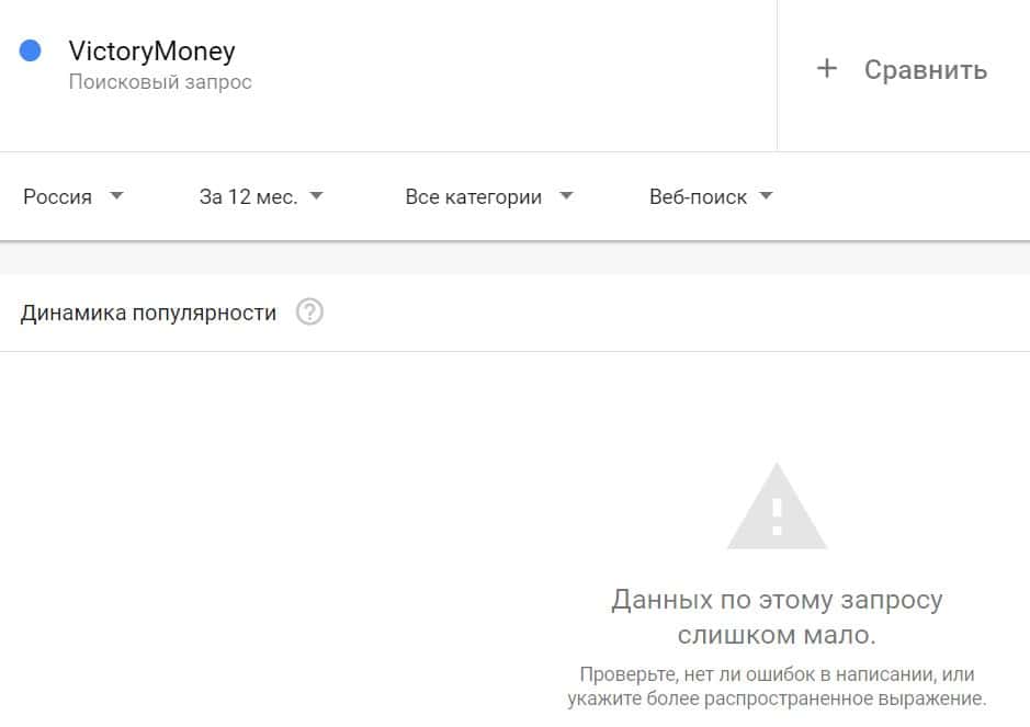 Посмотрим, насколько популярно название бренда "VictoryMoney", написанное на английском языке. Данных по этому запросу нет, так как люди не искали этот бренд в Гугл.