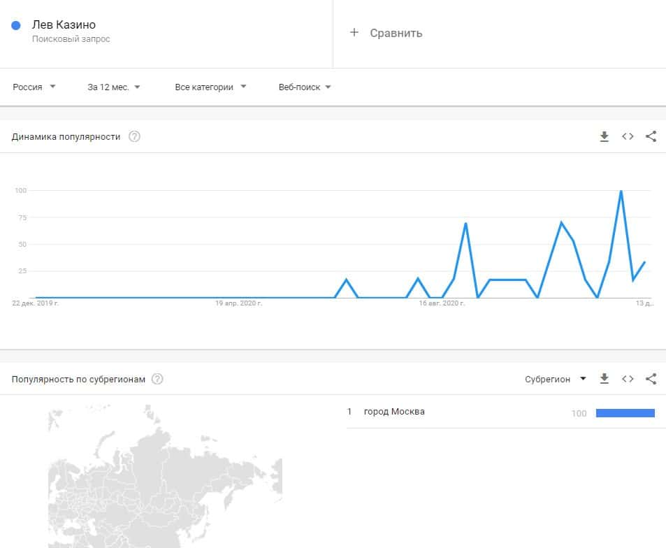 Посмотрим, сколько раз люди искали название бренда "Лев Казино" на русском языке с пробелом. Им интересовались преимущественно жители Москвы.