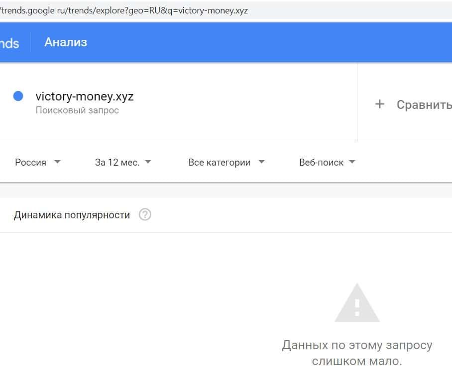 Доменное имя мошеннического сайта "victory-money.xyz" вбивали в поисковую систему Гугл слишком редко, поэтому данных по этому запросу практически нет.