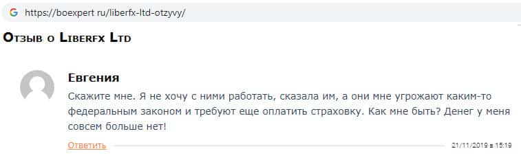 На сайте boexpert ru был замечен отзыв некой Евгении о том, что мошенники Либер ФХ ей угрожают каким-то федеральным законом и требуют оплатить какую-то страховку. Для того, чтобы не стать очередной жертвой обмана аферистов LiberFX не стоит оставлять какие-либо данные о себе на их сайте !!!