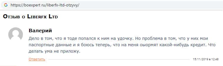 Некий Валерий на информационном сайте boexpert ru пишет о том, что оставил мошенникам конторы LiberFX свои паспортные данные не зная о жульнической деятельности данной организации. Это произошло потому, что пользователь поверил обещаниям компании Либер ФХ, которые могут пообещать все что угодно лишь бы обманным путем украсть деньги клиента.