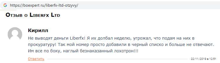 Некий Кирилл оставил свой комментарий о компании LiberFX на веб-сайте boexpert ru, где указывает, что данная мошенническая организация отказалась выводить его денежные средства, после чего жулики Либер ФХ заблокировали его аккаунт и внесли его в черный список.