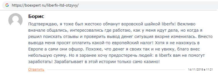 Некий Борис оставил свой отзыв о скам-конторе Либер ФХ на веб-площадке boexpert ru о том, что данная мошенническая организация отказывается ему выплачивать его денежные средства, заставляя оплатить какой-то европейский налог. На самом деле жулики LiberFX притворяются, что находятся в Европе, на самом деле это оффшорная скам-контора.