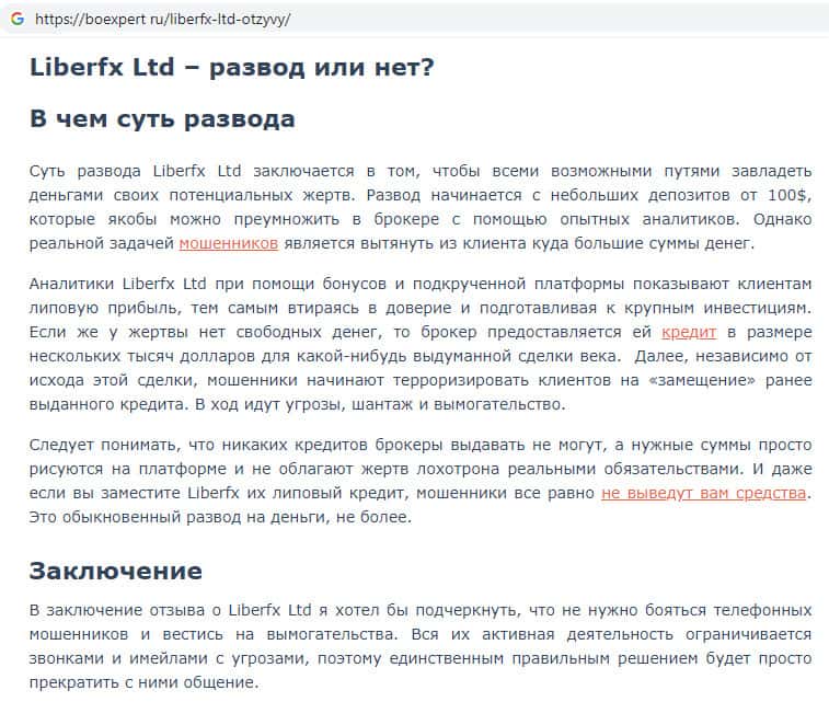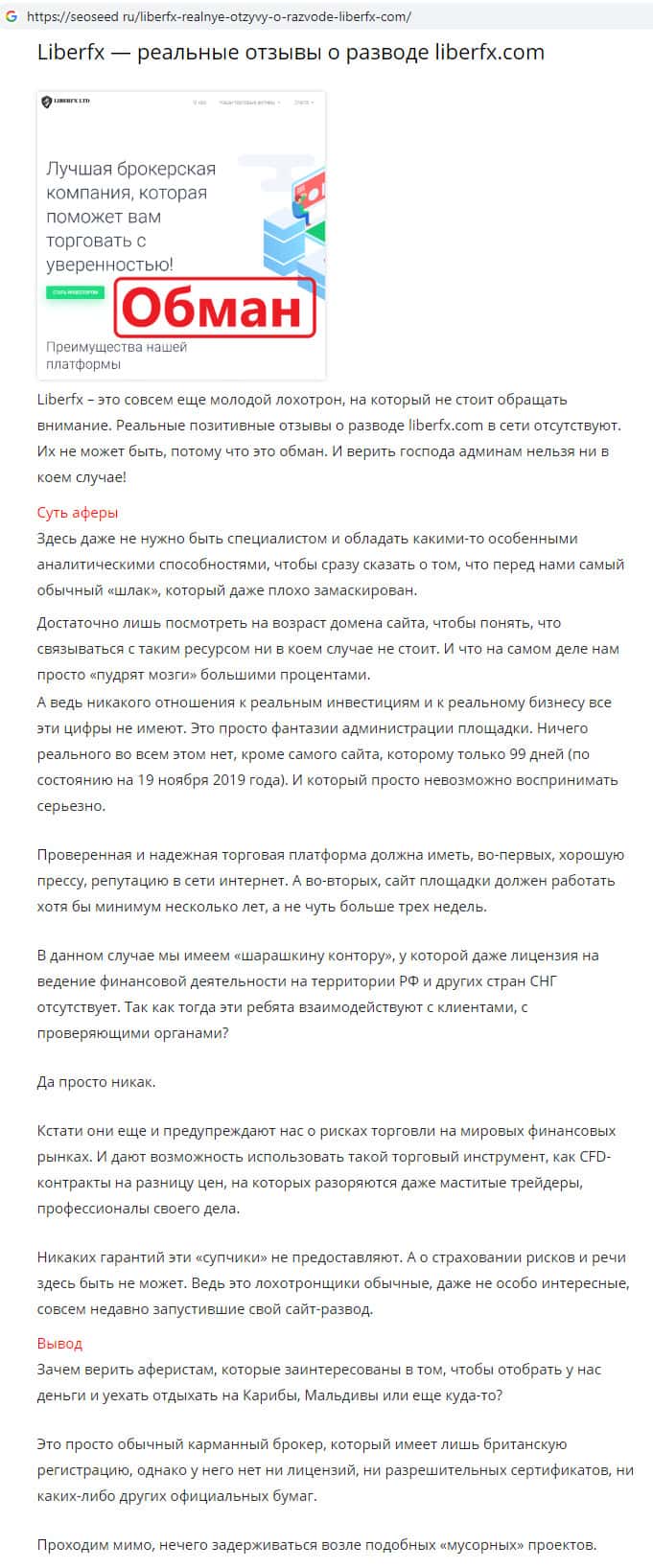 На информационном сайте seoseed ru была найдена статья об аферистах LiberFX, которые наживаются на людях воруя все денежные средства со счетов клиентов своей конторы. Верить мошенникам Либер ФХ нельзя ни в коем случае, потому что у данной конторы фальшивые документы и реального существования такой компании доказать невозможно.