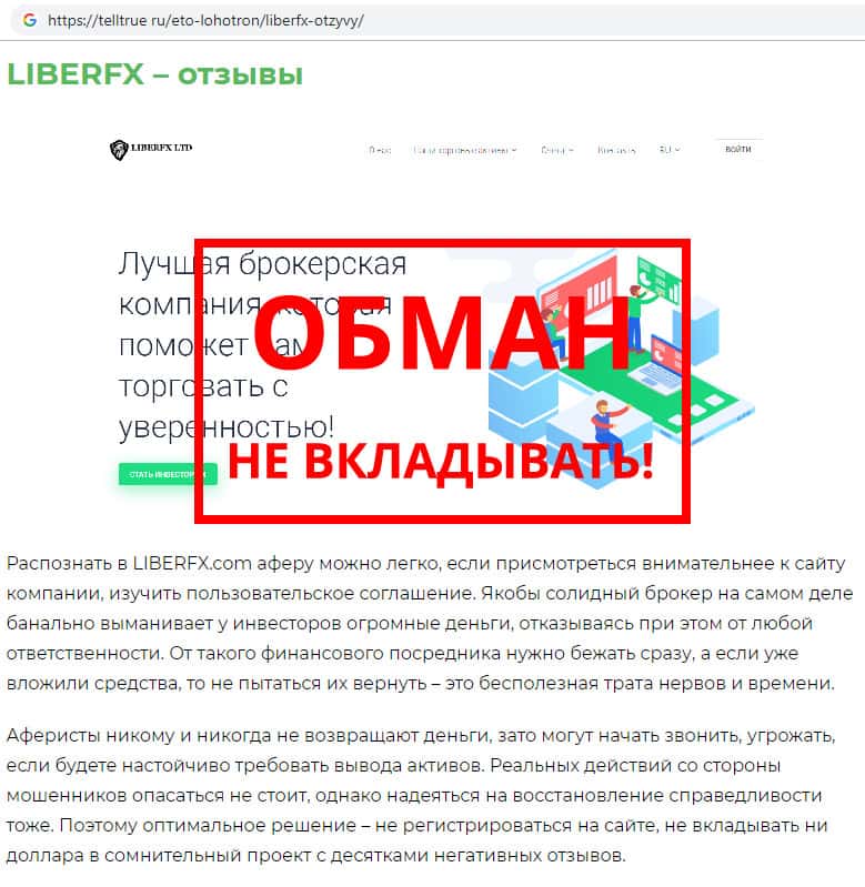 На веб-сайте telltrue ru обнаружена статья о том, как жульническая организация Либер ФХ обманывает людей рассказывая о якобы выгодных предложениях компании, после чего мошенники LiberFX воруют все денежные средства клиента, вгоняя его в долги и угрожая какими-то законами. Не тратьте зря свои силы, время, деньги и не связывайтесь с конторой Либер ФХ.