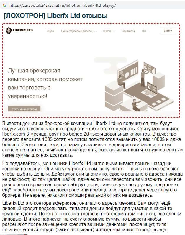 На веб-сайте zarabotok24skachat ru была замечена статья-отзыв о том, что аферисты LiberFX не выплачивают денежные средства своим клиентам. Для этого мошенники будут придумывать всевозможные предлоги, начиная от налогов и заканчивая угрозами того, что повесят на Вас кредит. Не верьте жуликам Либер ФХ и не связывайтесь с ними !!!