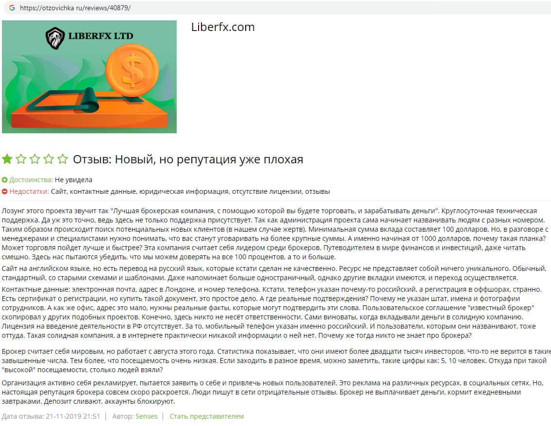 На веб-площадке otzovichka ru найдена информация о том, что скам-контора LiberFX выдает себя за лидера в сфере брокерских услуг, но на самом деле таким не является, потому что в глобальной сети интернет достаточно пользовательских отзывов, которые написаны людьми, которые связались с брокером Либер ФХ и остались в итоге ни с чем.