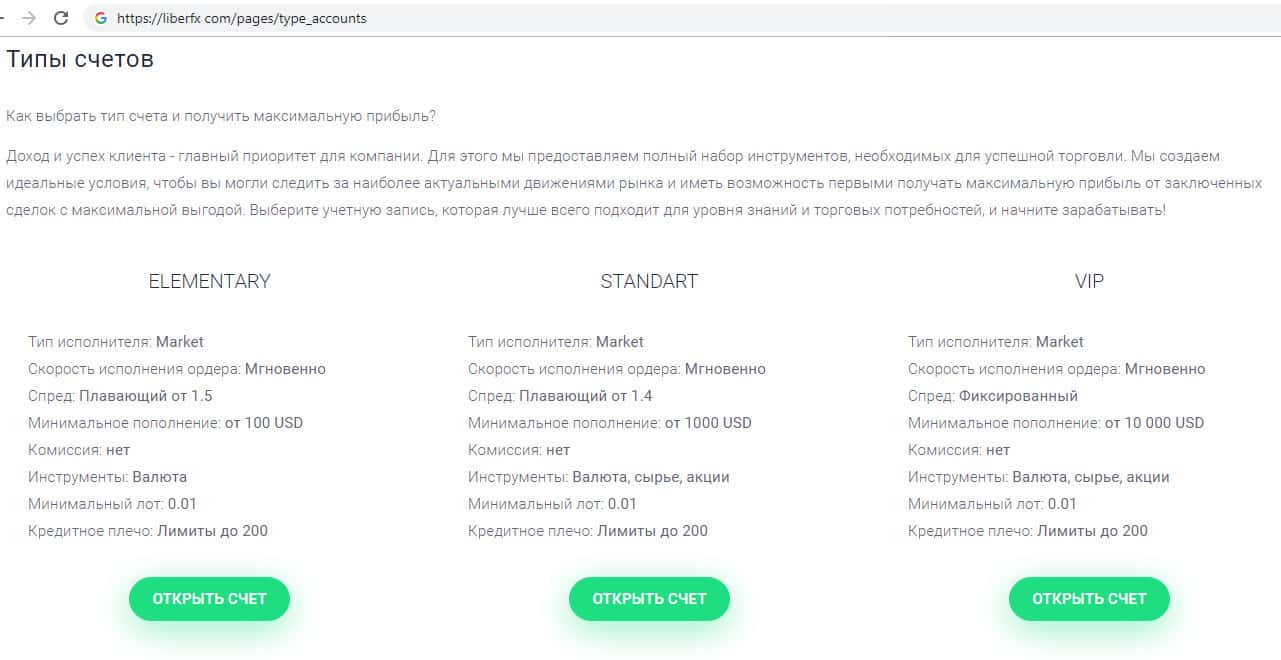 - Типы счетов представленных на сайте скам-организации LiberFX