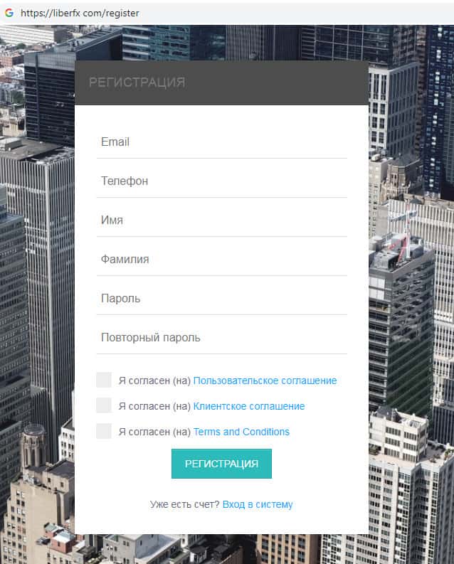 Для того, чтобы зарегистрироваться на сайте мошенников Либер ФХ необходимо адрес электронной почты, контактный номер телефона, имя, фамилию и конечно же пароль. Зарегистрировавшись Вы соглашаетесь с условиями пользования сайтом.