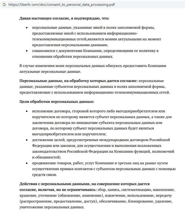 Подписав пользовательское соглашение предоставленное конторой Либер ФХ клиент дает согласие на обработку персональных данных, а именно на то, что использование, передачу, удаление, уничтожение и распространение своих персональных данных. Внимательно читайте условия компании LiberFX, прежде чем с ними связываться.