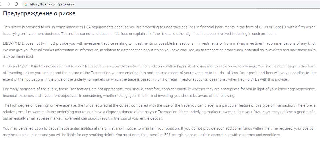 - Предупреждение о всевозможных рисках на сайте конторы Либер ФХ