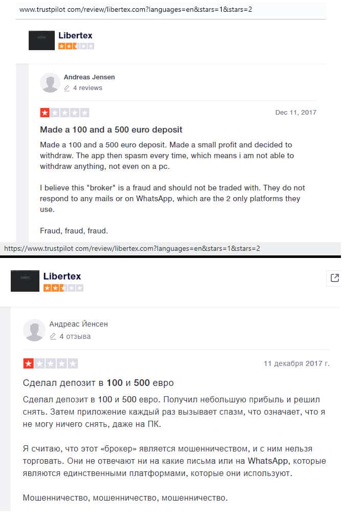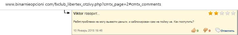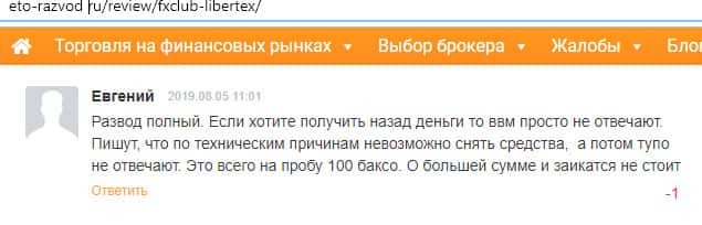 В следующем отзыве клиент конторы Libertex описал свою ситуацию, в которой он попал на 100 евро из-за действий лохотронщиков. Когда он пополнил торговый счет, то они заблокировали его аккаунт и доступ к деньгам. Теперь жертва ищет варианты вывода вложений и имеет некоторые сложности с этим.
