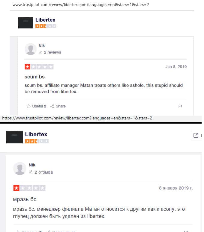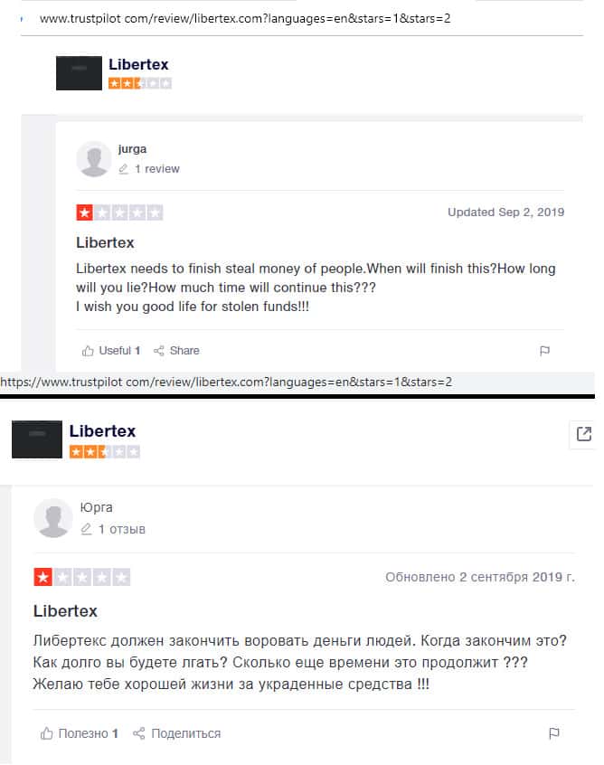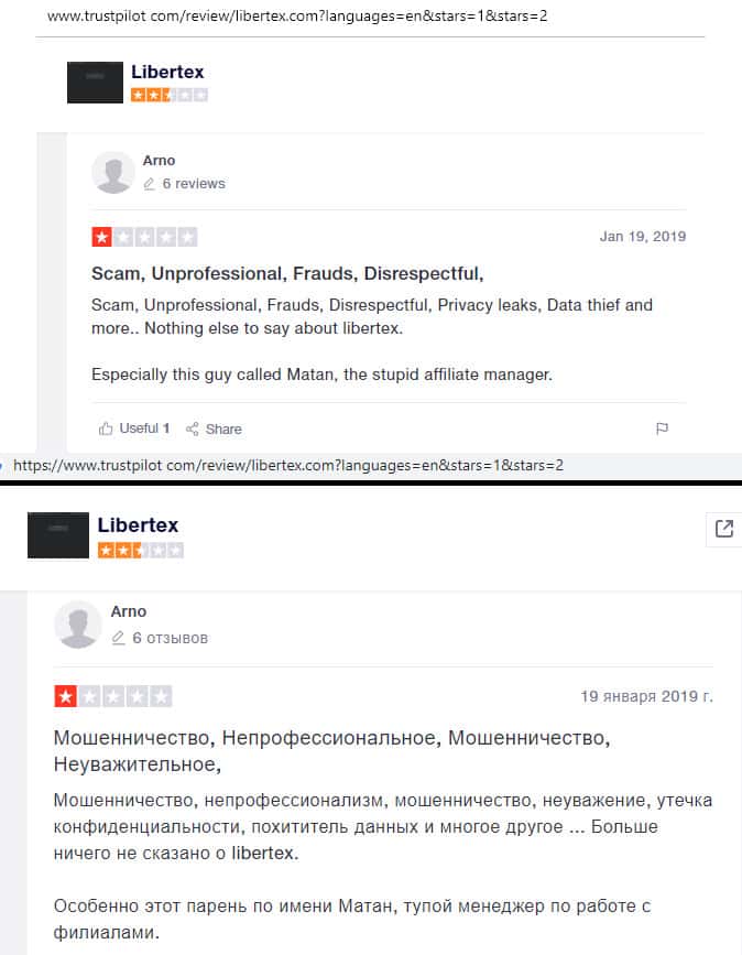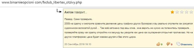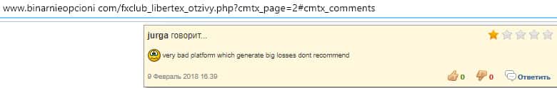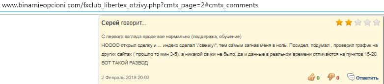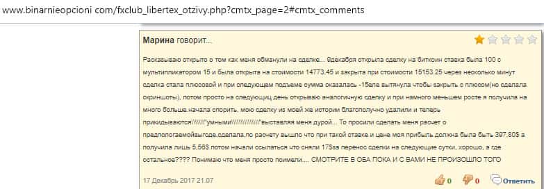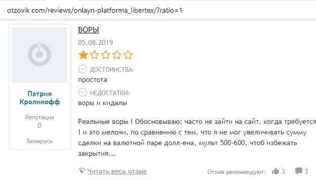 По мнению одного сайта-отзовика, контора Libertex разводит своих клиентов используя заезженные схемы. В интернете уже просто тысячи негативных отзывов, которые то и дело, что твердят о кидалове с их стороны. Аферисты обещают по телефону одно, а когда вкладываешь деньги, то получается совсем другое.
