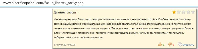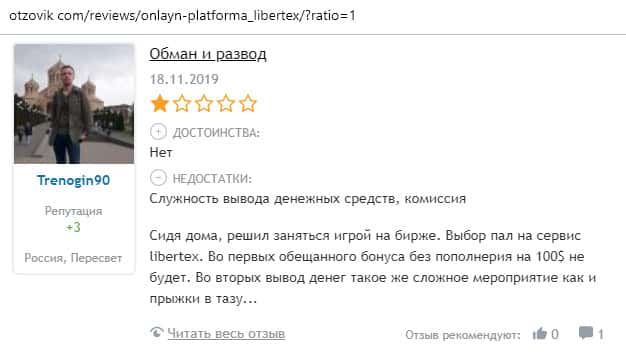 Ниже представлен еще один отзыв, в котором клиент конторы Либертекс по своей наивности попался на их удочку. По его словам это очередной лохотрон, который высасывает деньги из людей. Вначале все показалось довольно привлекательным, а вот после перевода средств отношение категорически поменялось в худшую сторону.