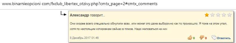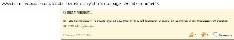 Ниже представлен еще один отзыв, в котором мошенническая организация Либертекс обворовала клиента. Человек рассказал, как лохотрон крадет деньги в открытую и теперь он собирает людей в один кулак, чтобы дать отпор этому лохотрону и написать коллективное заявление в полицию на их деятельность.
