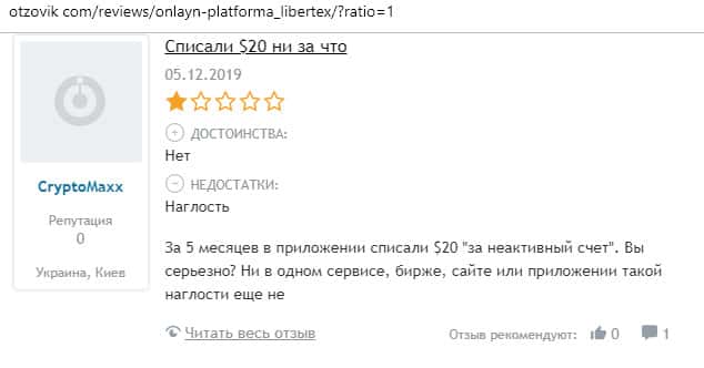 Далее представлен отзыв в котором аферисты Либертекс используют даже простои по счету себе в прибыль. Там сказано, что мошенники за 5 месяцев открытого счета списали с аккаунта клиентки 20 долларов США. Ни на одном сервисе еще такого не было, а тут просто нет слов происходящему.