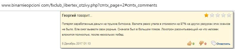 В очередной раз на контору Libertex написан негативный отзыв, так как аферисты просто в наглую слили счет клиента. Он торговал биткоинами и на их графике данный инструмент резко упал на 97%. Он еле смог спасти остатки в размере 3% от депозита, хотя обычно бывает, что не отдают даже одного доллара.