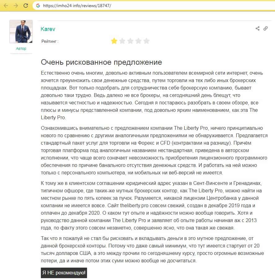 - Отзыв человека о лохотроне TheLiberty Pro с одного из веб-сайтов