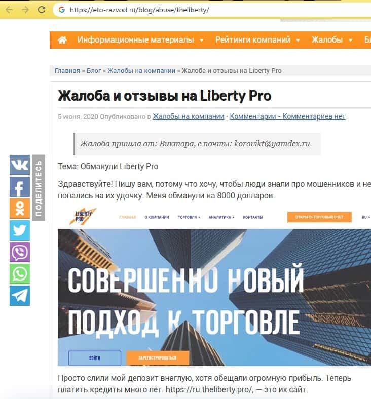 Страница в сети eto-razvod ru опубликовала жалобу на брокера TheLiberty Pro