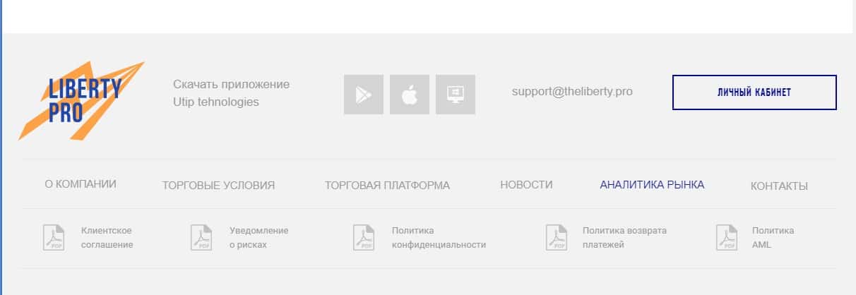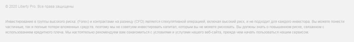 Описанию рисков при торговле у жуликов также отведён отдельный раздел на сайте. Но мы имеем также текст в конце сайта. Всё как обычно красиво написано, но как мы знаем и на заборе тоже написано. Кроме красивой обложки на платформе Либерти Про ничего нет. Что вы можете увидеть на изображении ниже.