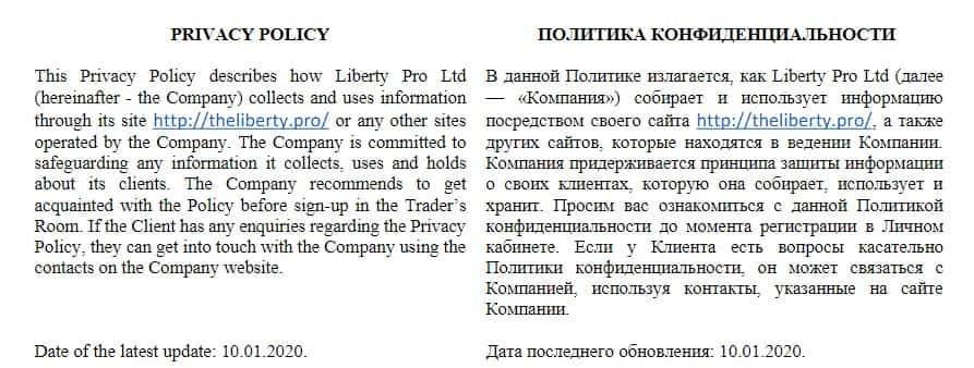 После в политике конфиденциальности у аферистов TheLiberty Pro следует условие о том, что мошенники Либерти Про по своему личному усмотрению могут передавать личные и персональные данные наивной клиентуры третьим лицам. На изображении, расположенном ниже, вы можете увидеть данные раздел политики конфиденциальности жулья.