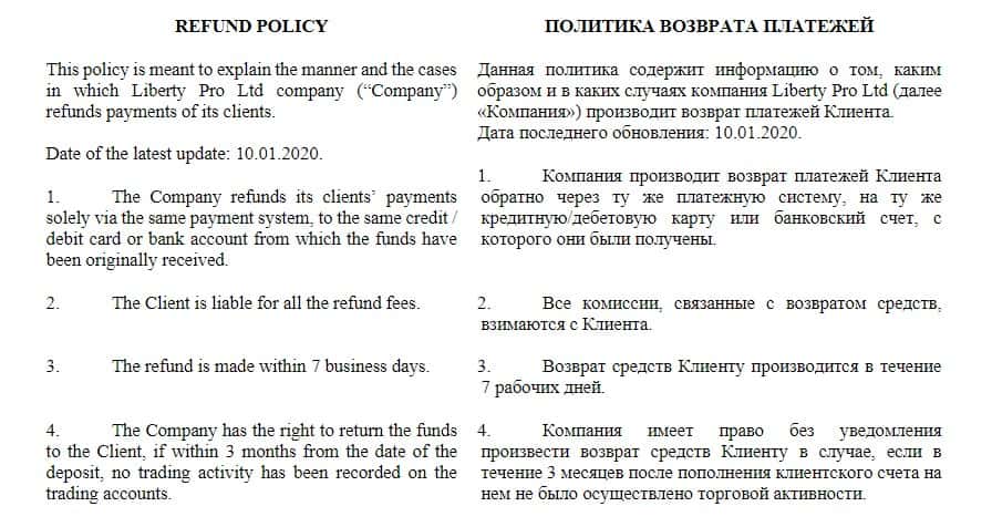 Раздел про платформы на сайте Либерти Про сделан полностью для того, чтобы привлечь внимание неопытного пользователя сети, который не имеет даже представления, как должен выглядеть реальный брокер. На изображении ниже можно увидеть, как мошенники TheLiberty Pro ловко подделывают документ, называя его политикой возврата.