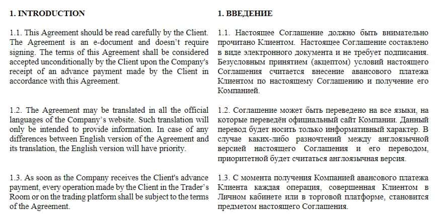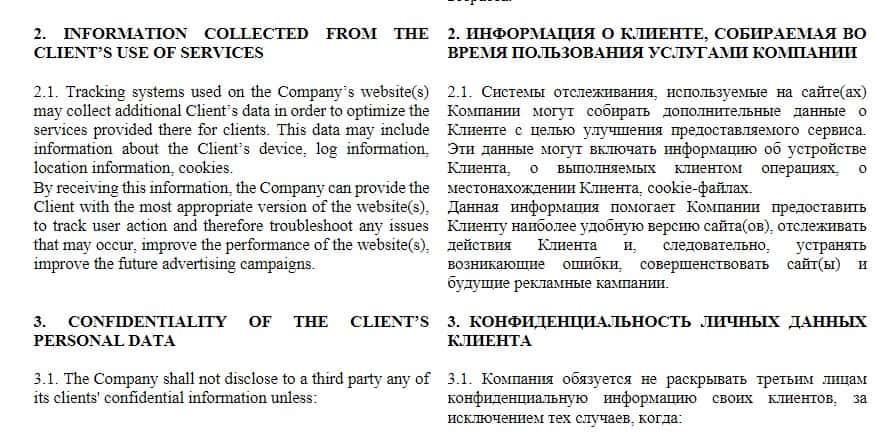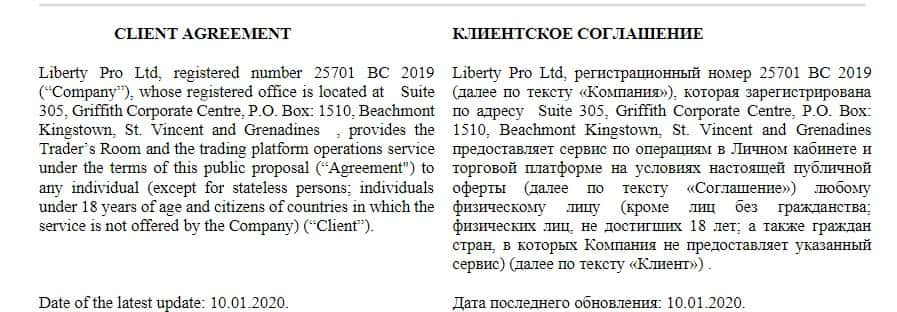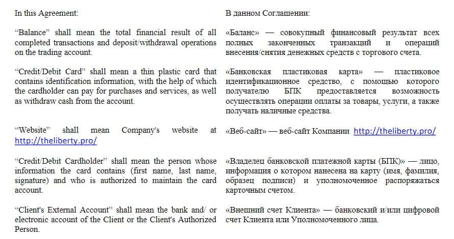 На официальном сайте мошенники TheLiberty Pro не выкладывают отдельных документов политики или условий сотрудничества, зато есть единый документ-договор, в котором описаны все моменты, входящие в сотрудничество сторон. Ниже вы видите первый раздел условий сотрудничества с аферистами Либерти Про.
