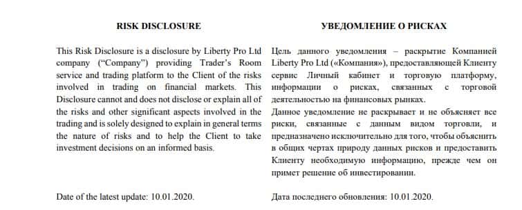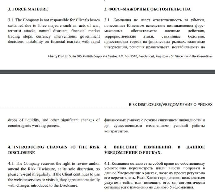 - Подозрительные предупреждения и отказ от ответственности конторой TheLiberty Pro