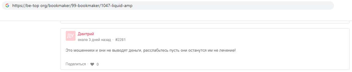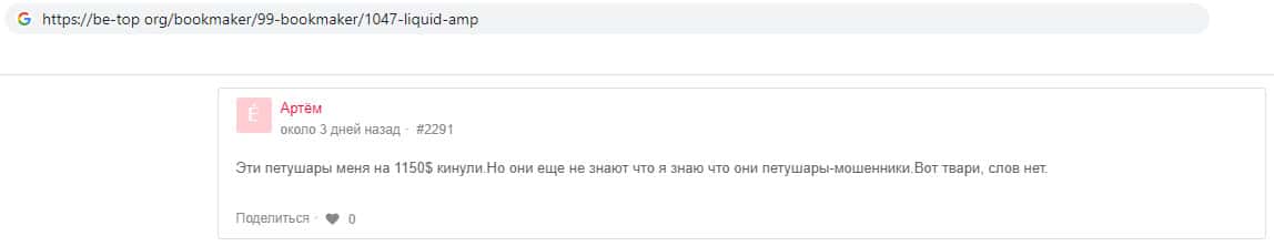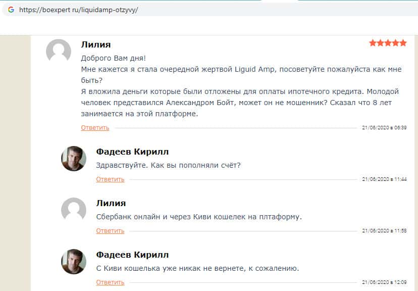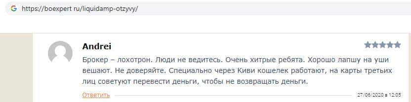 Автором данного отзыва о компании финансовых аферистач LiquidAMP стал бывший клиент компании. В отзыве он рассказал, что компания является мошеннической и она не выводит деньги. Удивительно что фирма ещё не успела удалить отзыв, так как пользователи видя то, что фирма не выводит средства, не захотят с ней сотрудничать.