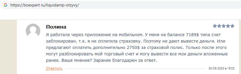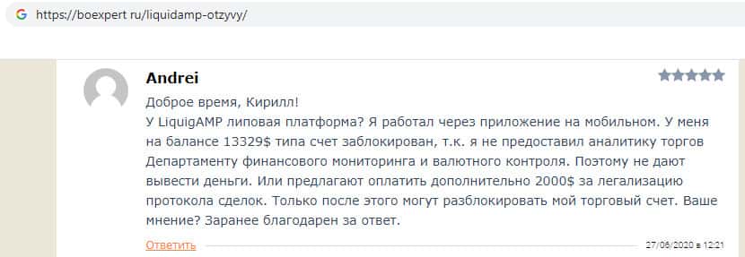 В данном отзыве о компании разводил LiquidAMP пользователь задаёт вопрос автору разоблачительной статьи, о том, лохотрон ли эта компания или нет. Он сотрудничал с фирмой некоторое время и заработал не маленькую сумму денег, но компания заблокировала счёт. Но предложила пользователю заплатить 2000 долларов, что бы разблокировать его.