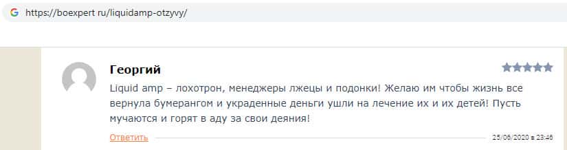 Вот очередной отзыв бывшего клиента компании LiquidAMP, которого лохотронщики кинули на 1150 долларов. В своём отзыве он называет компанию различными нецензурными словами. Его можно понять, так как это довольно не маленькие деньги, а компания просто воспользовалась доверием клиента, что бы отобрать его средства.