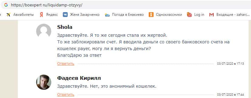 Вам представлен отзыв пользователя о компании кидал LiquidAMP. В нём он говорит что стал жертвой данного лохотрона. Он инвестировал деньги, но его счёт заблокировали. Теперь он интересуется, может ли он вернуть свои деньги обратно? но ему ответили что нет, так как он пополнял счёт с банковского счёта на анонимный кошелёк.