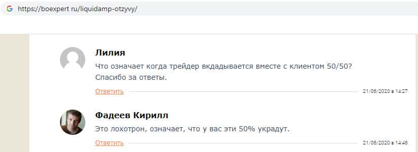 Пользователь написал отзыв о компании Ликвайд АМП, в котором спрашивает у опытного пользователя, правда ли то, что менеджер данной компании вложит 50 процентов суммы депозита для торговли. Пользователю ответили, что это лохотрон, так как никто вторую половину вкладывать не будет, а у пользователя отберут его 50 процентов суммы.
