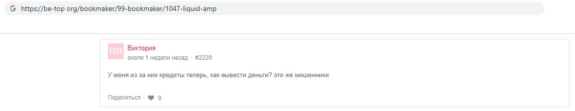 Некая Виктория написала отзыв о компании разводил LiquidAMP, так как она не знает что делать. Из за фирмы пользователь влез в кредиты и теперь их нечем отдавать. Она хочет знать как вернуть свои деньги, так же она назвала компанию мошеннической. Это не единственный случай, когда из за лжеброкера пользователи влезают в большие долги и кредиты.