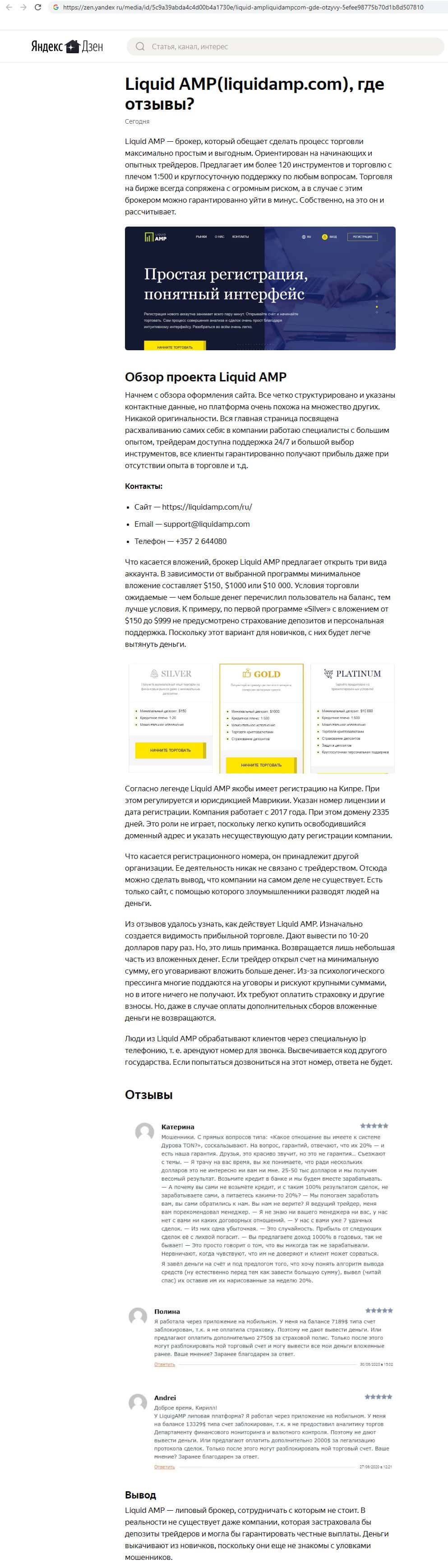 В поисках информации о кидалах LiquidAMP нам на глаза попала статья о компании на сайте zen.yandex ru. В неё интернет ресурс так же рассказал всю правду о компании и подтвердил, что эта фирма просто липовый брокер, который выкачивает деньги из новичков, которые ещё не знакомы с уловками финансовых мошенников.