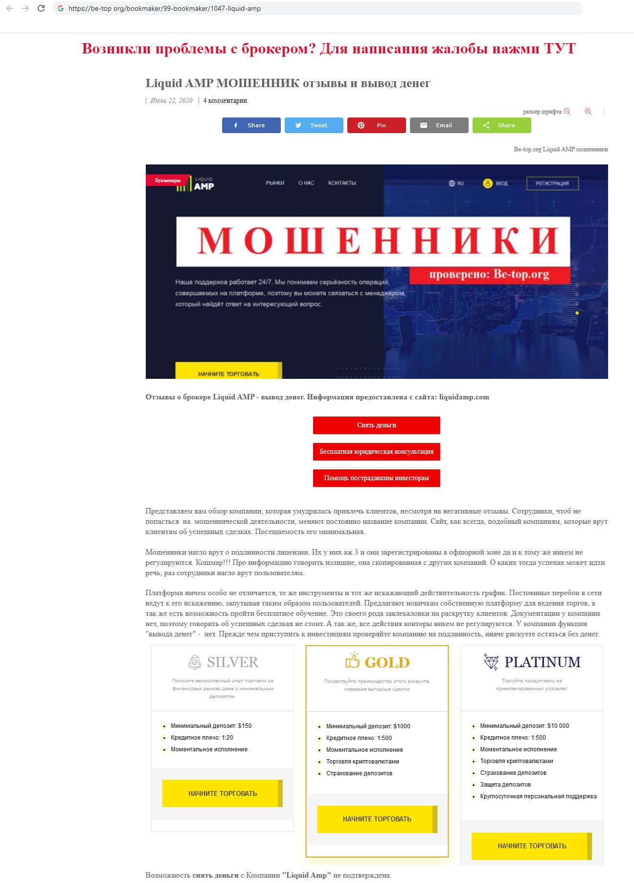 Мы наткнулись на разоблачительную статью о конторе кидал LiquidAMP на сайте bezobmana24 com. Сайт сказал, что это шаблонный лохотрон, который рассчитан на доверчивых пользователей, которые хотят заработать, но не понимают в торговле финансами. Данный лохотрон просто выкачивает деньги и более ничего не делает.