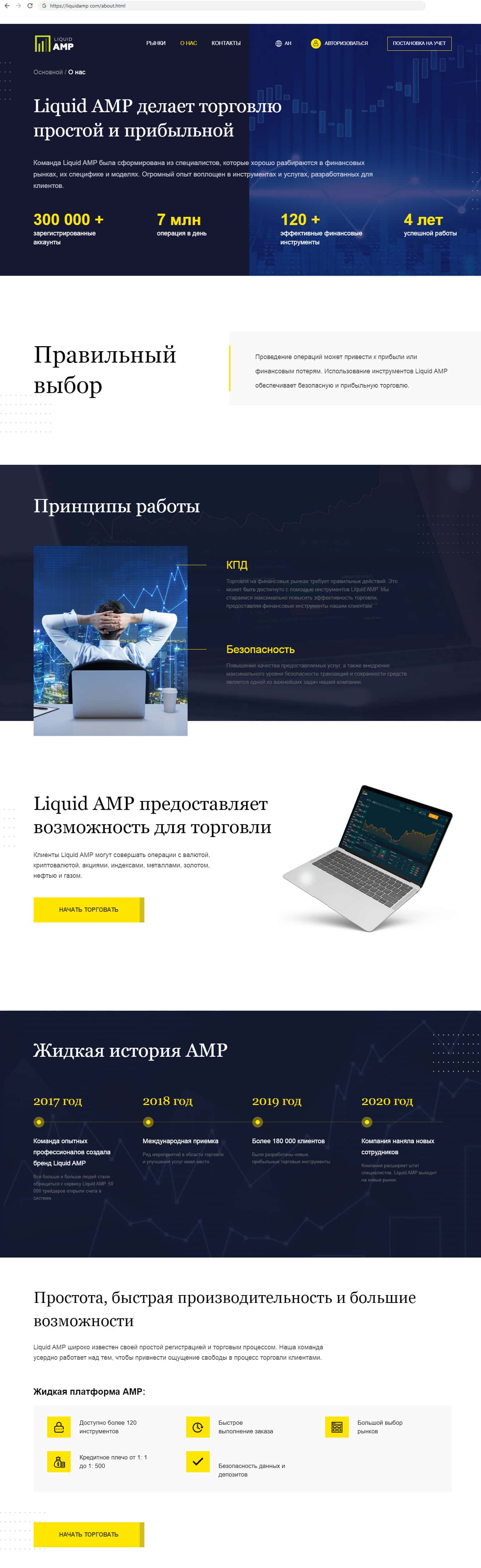Главный сайт компании разводил LiquidAMP это дешёвый коммерческий проект, который создан для выманивания денег из пользователей. Компания создала простой сайт по бесплатному шаблону, так как сайт даже не обладает фирменной оригинальностью. Сайт наполнен лживой и фальшивой информацией.