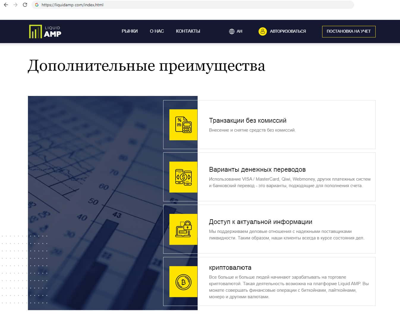 Далее аферисты LiquidAMP продемонстрировали фальшивые преимущества компании, в которые входят: транзакции без комиссий, множество способов вывода средств, доступ к актуальной информации и конечно же криптовалюта. Компания мошенников всеми способами старается впечатлить пользователей и привлечь их в свой лохотрон.